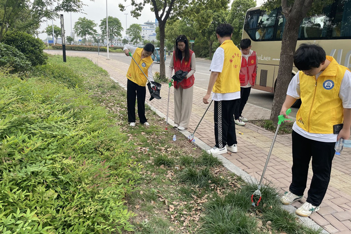 参观后,同学们在馆前广场上进行环境卫生清理。大家手持扫帚、垃圾夹和塑料袋,捡拾散落的塑料瓶和纸屑,清理烟头、树叶,分类回收可循环利用的物品,打造舒适环境,树立文明新风。