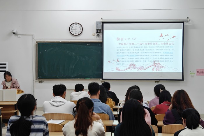 党的百年奋斗重大成就和历史经验,是在建党百年历史条件下开启全面建设社会主义现代化国家新征程、在新时代坚持和发展中国特色社会主义的需要,具有重大的历史意义和现实指导意义。尹成超从“为落实深化机构改革指明方向 ”“学习宣传贯彻党的二十大精神”“努力实现今年各项目标任务”“二十届二中全会号召”四个部分进行讲解,要求学生干部将挺膺担当的精神状态投身到学习、工作和生活中,坚定理想信念,发扬斗争精神,以最饱满的热情和奋力拼搏的精神迎接新的挑战。