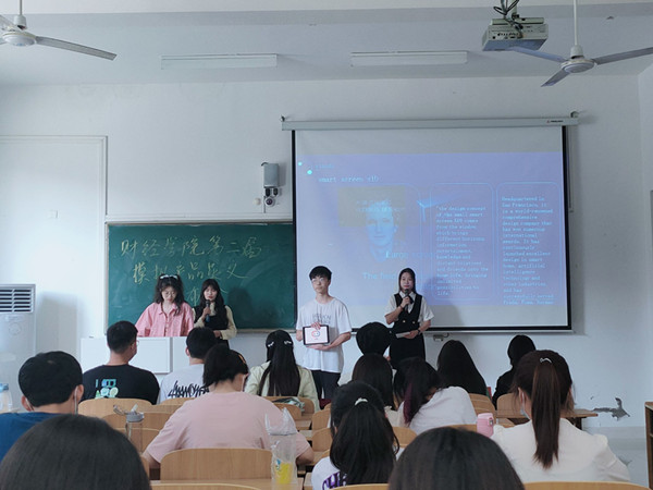 为切实提高学生专业技能和综合素质,5月4日下午,财经学院在致知楼A106成功举办第二届模拟产品英文发布会。安徽省大学生国贸技能大赛获奖队伍负责人柏孝宇、院社团管理部主席陆子涵、大学生创业协会会长郝宁、会计学习与交流协会会长武文君、数学学习与交流协会会长汪雨婷担任比赛评委。学院团委书记薛枫全程观看、指导比赛。