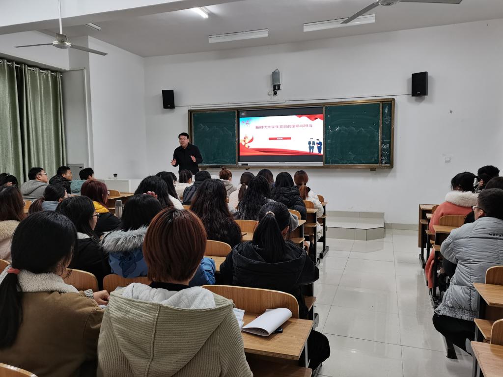 赵伟峰结合国内外形势和学校学院实际情况,立足大学生党员的日常学习、生活、工作等方面,从三个方面做了讲述:一、要深刻理解共产党员的精神内涵,始终牢记全心全意为人民服务的宗旨,以习近平新时代中国特色社会主义思想为指导,明晰党员不仅是荣誉、称号和身份,更是奉献、责任和使命。二、要持续加强党性修养,用党性的要求来修养自己,善于反省解剖自己,扎实履行好大学生党员的责任,志存高远,脚踏实地。三、要做到“四讲四有”,不断强化政治意识、大局意识、服务意识和看齐意识,加强党性锻炼和道德修养,从理论学习、干事创业、服务群众、遵纪守法、弘扬正气等五个方面做好引领示范,践行入党誓词,扎实履行好大学生党员的责任。
