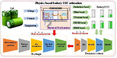 荷电状态(SOC)的可靠预测是高级电池管理系统(BMS)的重要功能之一,对电动汽车的安全运行具有重要意义。到目前为止,基于经验模型和数据驱动的锂离子电池SOC估计方法已在各种文献中进行了全面的讨论和综述。近年来,基于机理的SOC估计由于能为动力电池的内部状态提供了新的物理解释,并成为高级BMS最有吸引力的候选者。然而,很少有学者对涉及物理机理的SOC估计的研究进展及未来展望进行综述和讨论。更重要的是,一些利用物理的等效电路模型(PECM)和物理信息神经网络(PINN)的新兴SOC估计方法也没有在当前的综述论文中得到总结和分析。为此,本综述论文主要总结了基于物理的SOC算法在高级BMS中的应用潜力,深入探讨了锂离子电池物理SOC估算方法的研究进展及面临的挑战。该研究成果中的见解有望促进基于物理的高级BMS算法的发展和应用。