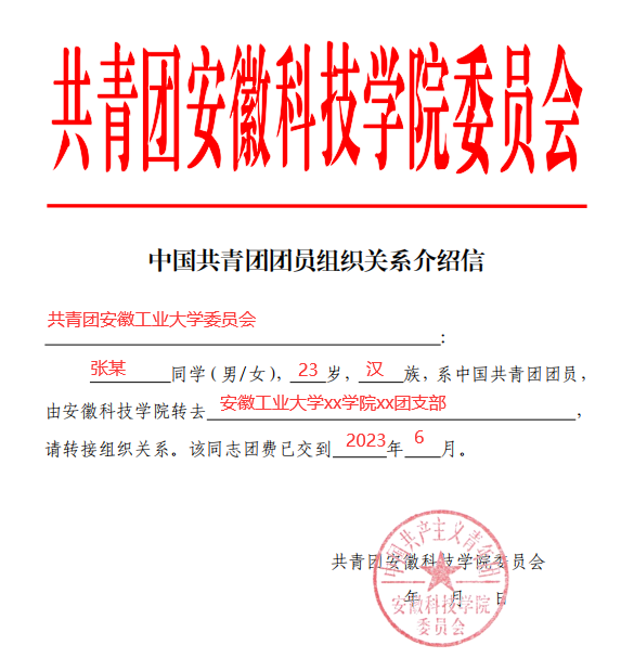 各团支部如有需要开具团关系转接介绍信的团员,请自行彩印《中国共青团团员组织关系介绍信》(见附件6),自行按照填写模板填写。