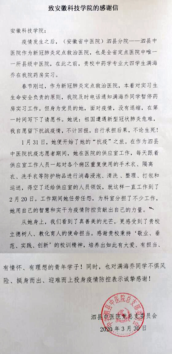 感谢信中,泗县中医院对我校围绕立德树人总任务,培养了像满海乔同学这样有大爱、有担当、有情怀、有理想的青年学子给予了高度评价。对满海乔同学不惧风险、挺身而出、迎难而上投身疫情防控表示诚挚感谢。(特约通讯员:石志成  审核:何永勇 编辑:汤帅)