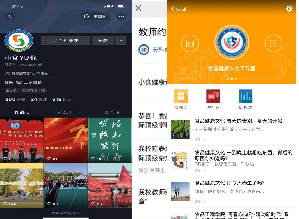 搭建好四个网络宣传平台。学院的文化品牌建设和文化活动不仅需要扎扎实实地做,更需要新闻媒体大力宣传报道,学院坚持“一手抓活动,一手抓宣传”的指导思想,在做好校园网新闻报道的基础上,十分重视新网络平台的建设和利用,近年,学院先后建设了“安科食安”微信公众号、“小食YU你”抖音号(“YU”是“娱”或“育”“予”的汉语拼音,有“娱乐”、“培育”、“给予”之意)以及安科易班(食品工程学院)、QQ公众号等四个网络平台,并根据四个平台的宣传特点,通过“文字、图片、语音、视频、动画”等方式对学院相关的文化活动进行全覆盖立体式宣传报道,较好的宣传了学院,对学院文化品牌的塑造和文化育人的效果产生了较好的影响。