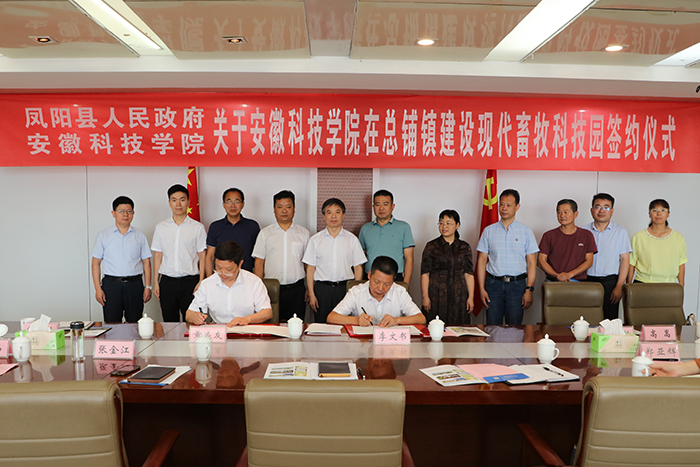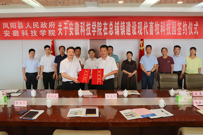 7月30日上午,我校与凤阳县人民政府建设现代畜牧科技园签约仪式在凤阳校区图书馆十楼会议室举行。校党委书记蒋德勤,校党委委员、副校长黄远友,教务处处长赵伟峰,财务处处长王伟,国有资产管理处处长郑亚辉,动物科学学院院长刘德义,凤阳县人民政府副县长李文书,凤阳县农业农村局局长高嵩、凤阳县总铺镇党委书记张金江及凤阳县司法局、自然资源和规划局等单位负责同志出席仪式。