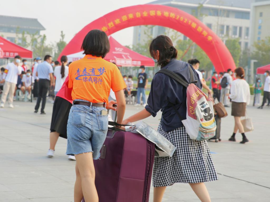 晨雾还未散去,志愿者们便早早来到了报到点时刻准备为新生们服务。身披马甲的“小红人”和“小黄人”们积极地帮助学弟学妹们搬运沉重的行李、引导新生们登记信息。