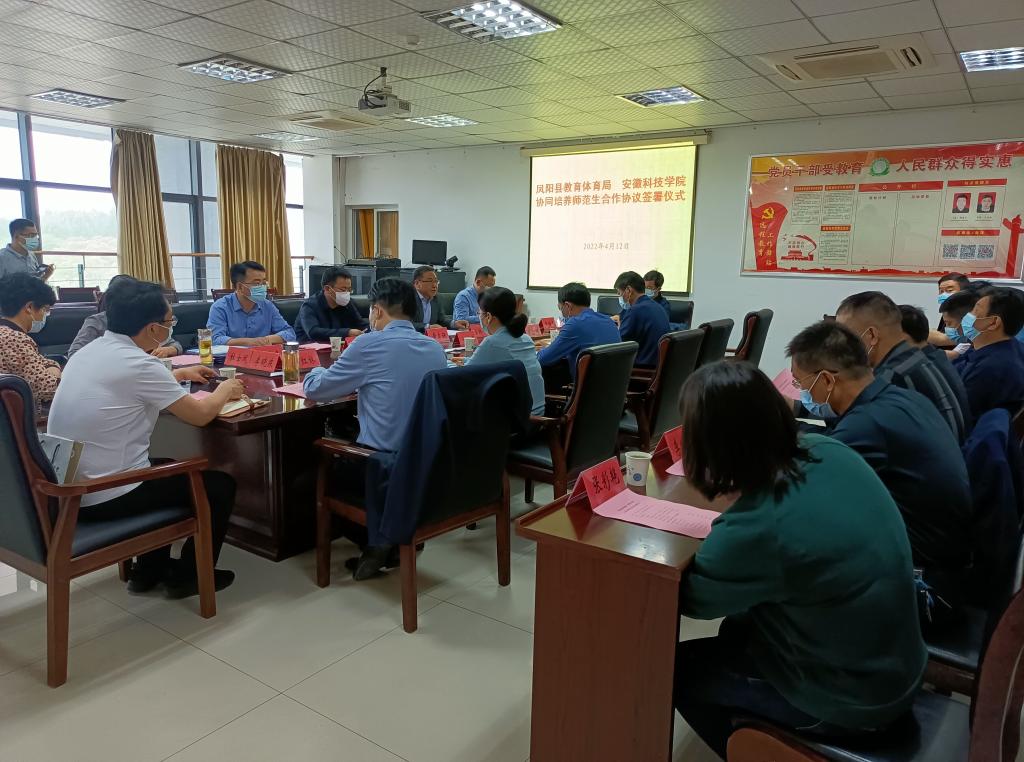 为积极探索师范生教育实践工作,建立高校、地方教育行政部门和基础教育学校权责明晰、稳定协调、合作共赢的“三位一体”师范生协同培养机制,构建教师培养、培训、研究和服务一体化的合作共同体,推动我校师范类专业认证工作,4月12日下午,MILAN.COM与凤阳县教育体育局协同培养师范生合作协议签署仪式在凤阳县教育体育局三楼会议室隆重举行。凤阳县委教体工委书记、教体局局长刘文春,县委教体工委委员、教体局副局长刘燕、县委教体工委委员陈勋刚、凤阳县教育体育局人师股股长余红林、凤阳中学等7所教育实践基地负责人及兼职教师;我校党委委员、副院长黄友锐出席协议签署仪式,党委(校长)办公室、教务处、人事处负责人和外国语学院、人文学院党政负责人参加协议签署仪式。签约仪式由我校党委(院长)办公室主任曾献功主持。