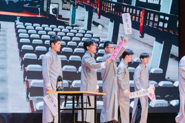 颁奖结束后,由我校师生共同创作表演的庆祝中国共青团成立100周年舞台剧《觉醒》举行首演。《觉醒》通过舞台艺术的形式再现了五四运动那段救亡图存、激情燃烧的岁月,展现了一个民族从沉睡到觉醒的时代故事。舞台剧共有八幕,依次呈现袁世凯签订二十一条卖国条约,陈独秀、李大钊、毛泽东等爱国青年探索寻找救亡图存道路,创办新青年、传播马克思主义、五四游行示威、中国共产党成立等重大历史事件,表现了中国青年的身影活跃在每一次影响国家民族进程的重大历史事件里,在各个领域为国家民族的解放斗争、发展进步和繁荣富强奉献力量;表达了一百年来在中国共产党的坚强领导下,中国青年已成为国家振兴、民族崛起的最重要力量之一,当代青年更是要“承风骨亦有锋芒,有梦则刚”,在新时代的青春赛道上奋力奔跑出当代青年的最好成绩。舞台剧从创作、排练到演出,学生全程深度参与,每一个角色、每一个动作、每一个细节均倾情打造,用心用情用力演出了精气神,在舞台上为广大师生呈现出了一堂生动的思政课。