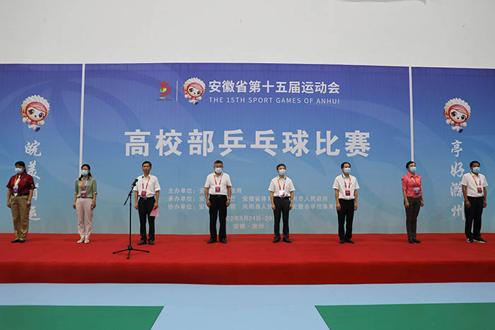晁新宣布第十五届省运会高校部乒乓球比赛正式开赛。