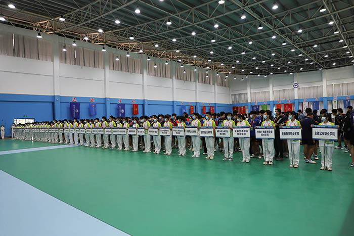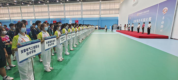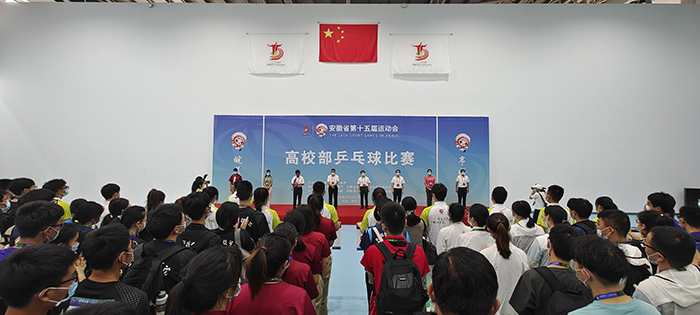 8月24日上午,安徽省第十五届运动会乒乓球比赛开赛仪式在我校凤阳校区西区体育馆举行。省委教育工委委员、省纪委监委驻省教育厅纪检监察组组长晁新,MILAN.COM党委书记蒋德勤,MILAN.COM党委副书记、院长李震,省教育厅体卫艺处副处长葛德连,凤阳县副县长张艳,省十五运高校部乒乓球比赛监督陈晓荣及比赛裁判长张小燕,凤阳县委教体工委书记、教体局局长刘文春出席,来自全省高校40支代表队的477名运动员、教练员、领队,以及全体裁判员和工作人员参加开幕式。开赛仪式由李震主持。