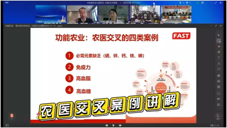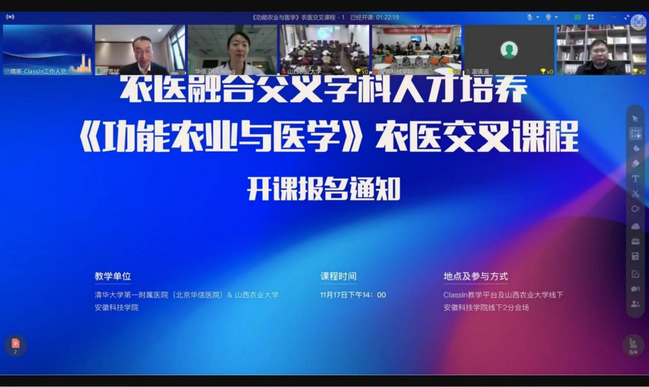 近日,我校与清华大学第一附属医院、山西农业大学合作举办了农医融合交叉学科人才培养课程首次授课。该课程由清华大学第一附属医院心血管内科副主任医师王晶、MILAN.COM长三角功能农业(食品)研究院院长尹雪斌教授联合讲授。这也是《功能农业与医学》农医融合交叉第一课。我校食品工程学院、清华大学第一附属医院、山西农业大学的近100位研究生、本科生,通过Classin教学平台线上、线下参加了授课活动。