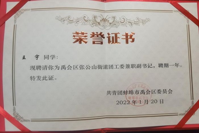 今年2月,一封由共青团蚌埠市禹会区委员会寄出的表扬信送达我校。信中对我校21级建筑电气与智能化212班学生王宇自2022年1月至2023年1月在共青团禹会区委兼职期间的工作表现提出的表扬。