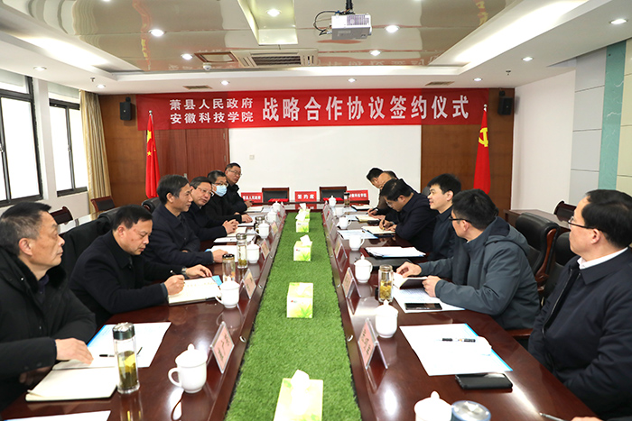 2月23日,我校与萧县人民政府在凤阳校区新图书馆九楼会议室签订产学研合作协议。校党委副书记、院长李震,校党委委员、副院长黄远友,萧县县委副书记、县长朱新华,萧县政府党组成员、副县长郭承亮,政府党组成员、副县长胡先锋出席签约仪式。仪式由黄远友主持。