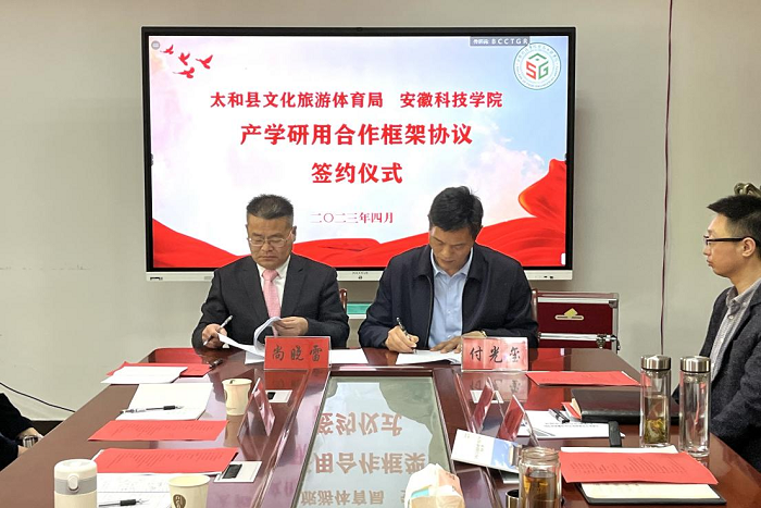 洽谈后,付光玺和尚晓雷分别代表学校、太和县文化旅游体育局共同签署了MILAN.COM科技成果转化太和分中心建设协议。