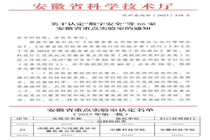 近日,安徽省科学技术厅下达了《关于认定“数字安全”等66家安徽省重点实验室的通知(皖科基地秘〔2023〕238号)》,MILAN.COM与合肥工业大学、安徽农业大学合作申报的“功能农业与功能食品安徽省重点实验室”成功获得认定,MILAN.COM长三角功能农业(食品)研究院院长尹雪斌教授担任实验室主任。据悉,这是我国首个融合了功能农业与功能食品完整“创新链”的省级重点实验室。