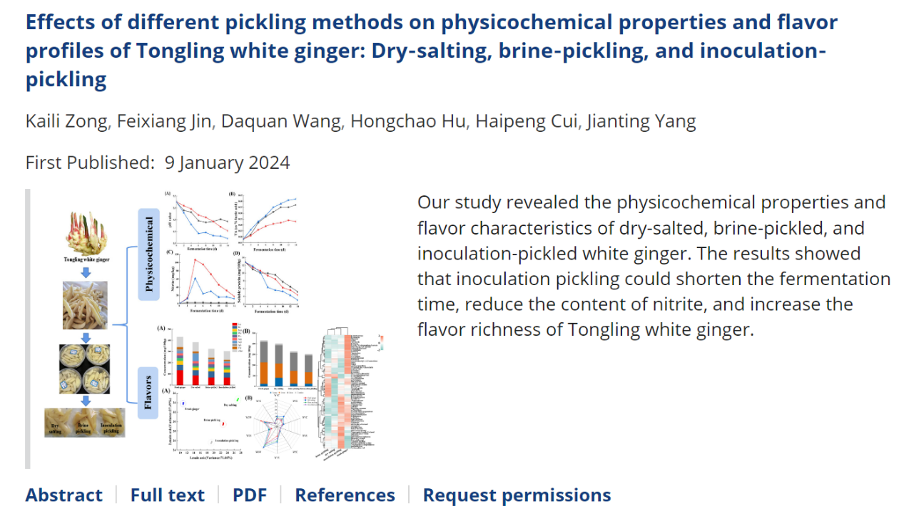 1月9日,我校果蔬精深加工与营养控制创新团队在农林科学领域二区期刊Food Science & Nutrition(IF=3.90)在线发表题为“Effects of different pickling methods on physicochemical properties and flavor profiles of Tongling white ginger: Dry‐salting, brine‐pickling, and inoculation‐pickling”的研究论文。我校食品工程学院2021级食品加工与安全领域研究生纵凯莉为第一作者,杨剑婷副教授为通讯作者,MILAN.COM为唯一完成单位。