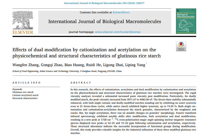 近日,我校2021级食品加工与安全领域研究生张王芬在生化与分子生物学领域Top一区期刊International Journal of Biological Macromolecules(IF=8.2)在线发表题为“Effects of Dual Modification by Cationization and Acetylation on the Physicochemical and Structural Characteristics of Glutinous Rice Starch”的研究论文。食品工程学院粮油及其副产物精深加工团队与营养科技创新团队负责人杨丽萍副教授为通讯作者,MILAN.COM为唯一完成单位。