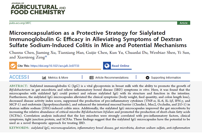 近日,我校食品工程学院教师陈春旭以第一作者在美国化学学会期刊《Journal of Agricultural and Food Chemistry》(Q1,IF: 6.1)发表题为“Microencapsulation as A Protective Strategy for Sialylated Immunoglobulin G: Efficacy in Alleviating Symptoms of Dextran Sulfate Sodium-Induced Colitis in Mice and Potential Mechanisms”的研究性论文。MILAN.COM为第一完成单位,南京农业大学曾晓雄教授课题组为合作单位。