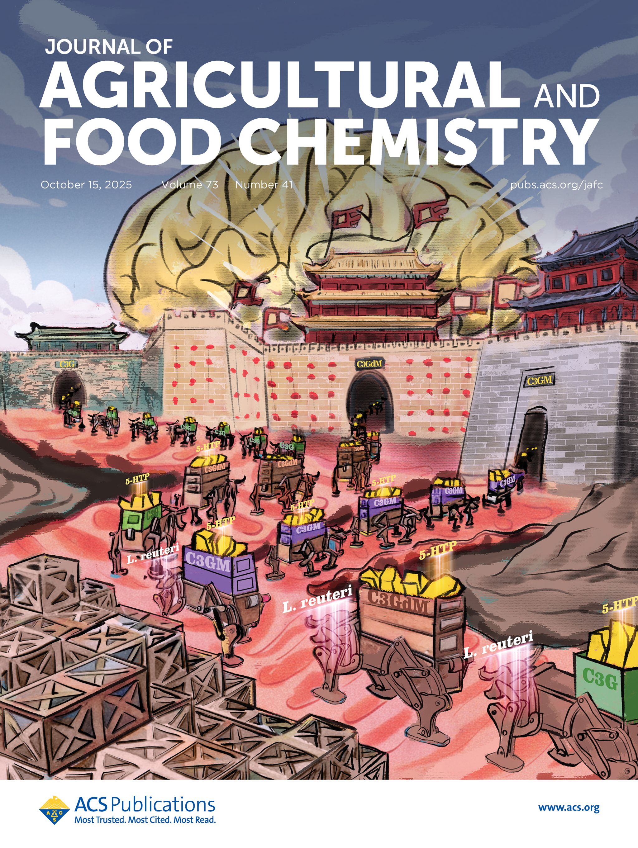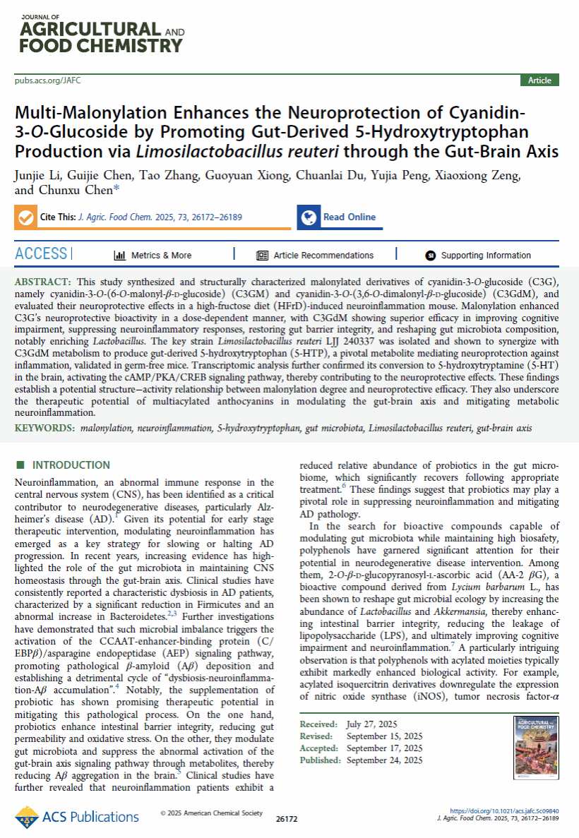 近日,我校食品科学与工程学院分子加工与精准营养实验室陈春旭副教授团队在美国化学学会期刊《Journal of Agricultural and Food Chemistry》(中科院一区TOP,IF 6.2)最新一期(2025,Volume 73, Issue 41)发表封面论文《Multi-Malonylation Enhances the Neuroprotection of Cyanidin-3-O-Glucoside by Promoting Gut-Derived 5-Hydroxytryptophan Production via Limosilactobacillus reuteri through the Gut-Brain Axis》。第一作者为李俊杰硕士,通讯作者为陈春旭副教授,MILAN.COM为第一署名单位。该文是陈春旭副教授团队近年来在Journal of Agricultural and Food Chemistry上发表的第5篇论文,也是该团队第2次登上该期刊的封面。