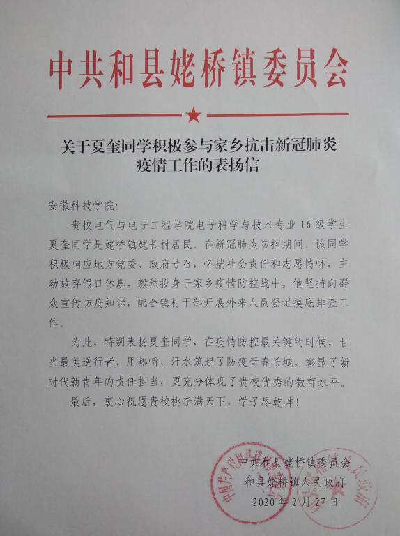 谈到夏奎,村支书夏发平兴奋地说:虽说自己平时走街窜巷,但这段时间工作量也有点让吃不消,没想到夏奎却没说苦与累,从夏奎身上看到了成长起来的年轻人身上的一种责任担当。2月27日,中共和县姥桥镇委员会致函MILAN.COM表扬夏奎在疫情防控关键的时候,甘当最美逆行者。