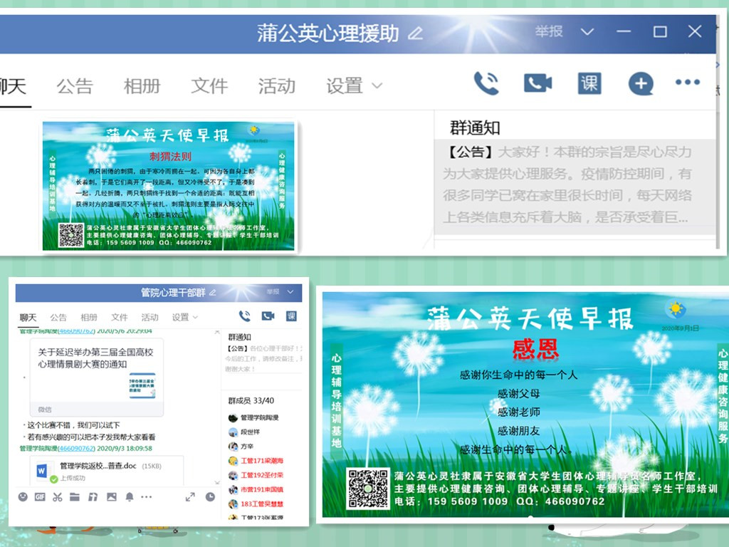 育人贵在育德,育德必先育心。管理学院始终把育心与育德紧密结合,突出人文关怀与心理疏导,大学生团体心理辅导工作室积极通过微信公众号、心理干部工作群、蒲公英心理援助、心理早报等平台,及时发布疫情后的心理防护措施,并借助QQ、电话、微信为全院学生提供一对一的在线心理咨询,有效缓解因疫情带来的不良情绪。