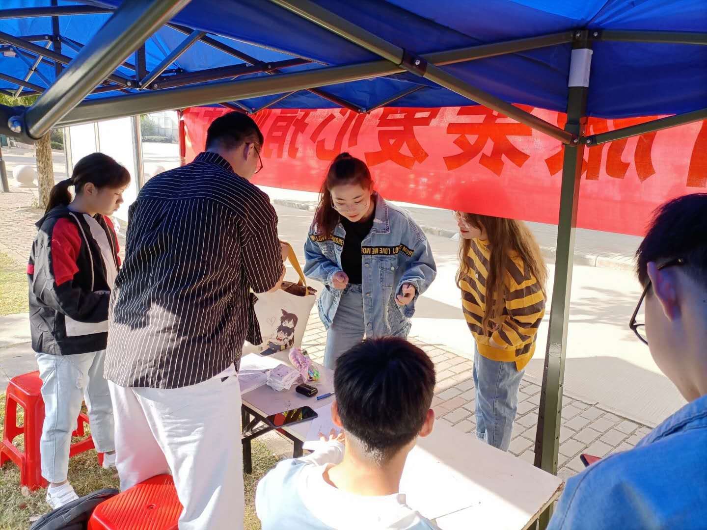 此次活动在凤阳校区东区和西区分别设立了捐赠点。活动开始之前,2019级的同学通过贴海报、发官方QQ、拉横幅、做展板等宣传方式,扩大了活动的知晓度。准备工作完成后,2020级新生便带着自己洗干净的、叠得整整齐齐的军训服来到捐赠现场,献出自己的一份爱心。青年志愿者们耐心地接待每一位前来捐赠的新生,引导新生进行信息登记,并进行有序捐赠。