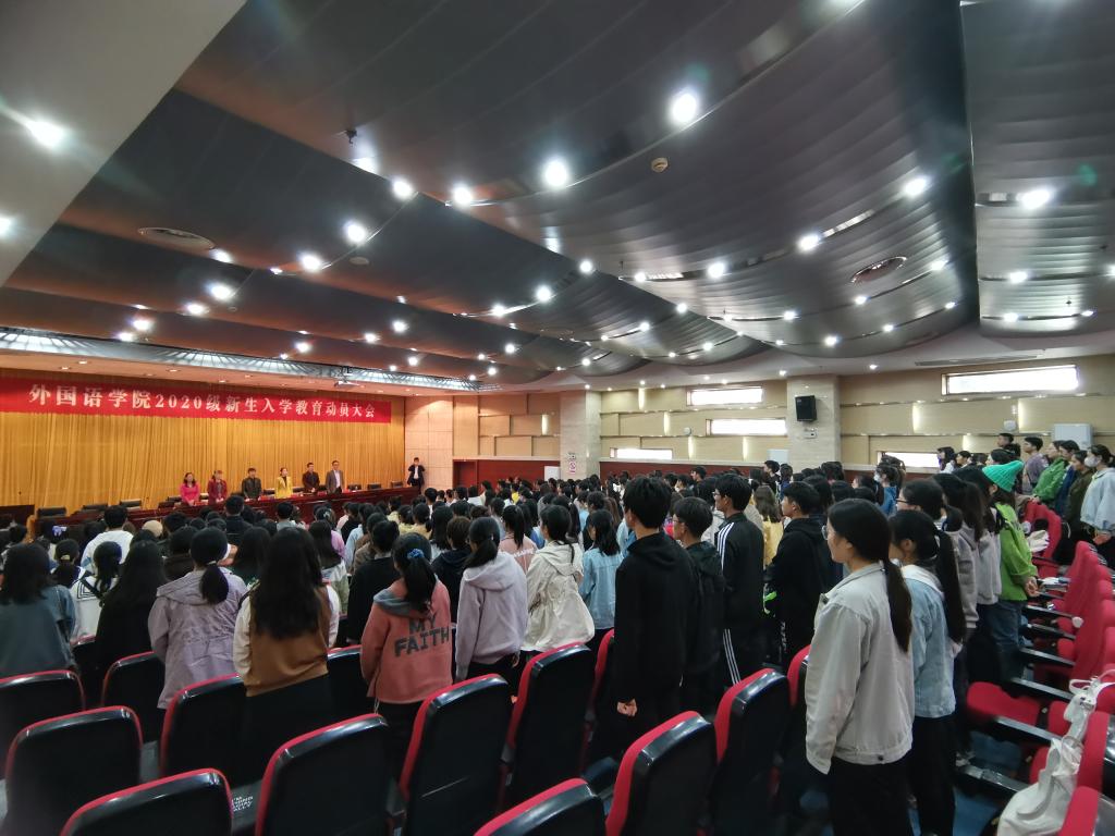 丹桂飘香,金秋送爽。20级新生带着青春的活力,带着对知识的不懈追求,带着对大学校园生活的无限憧憬,迈进了MILAN.COM外国语学院。为了让新生更快适应新环境,适应新的生活,顺利、平稳、有效地进入大学生活。10月21日下午14:00,外国语学院在新图书馆第二报告厅举行了新生入学教育动员大会。外国语学院院长陈德用、党总支书记蔡为青、副院长刘萍、教学秘书周海平、分团委书记陈慧中、专职辅导员宋兵兵,外国语学院教师代表,全体20级新生参会,大会由刘萍主持。