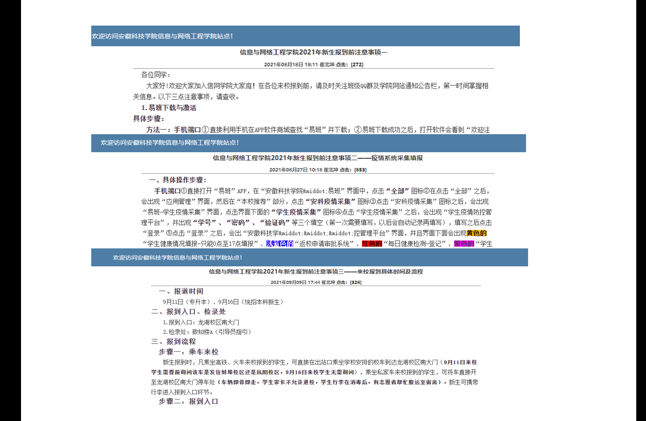 据悉,目前三篇注意事项的通知,网络点击量已达1000多次,仅“信息与网络工程学院2021年新生报到前注意事项二——疫情系统采集填报”一篇的点击量已达800多次。2021级的新同学通过学院的官网提前了解了学校学院,通过辅导员和学生党员的教育引导树立了新的目标,做好了来校前的各项准备,为他们即将展开的大学生活打下了坚实的基础。(特约通讯员:李军成 审核:韦乃学 编辑:张威)