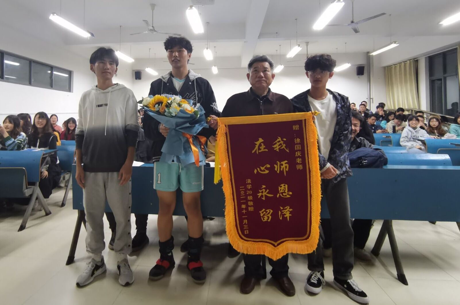 退休前的最后一堂课,法学2020级的学生们为徐国庆送上了锦旗、花束与贺卡。贺卡上写着:老师,您辛苦了。这贺卡的最后不仅仅是结尾,也是学生们为他教学生涯画上的圆满句号。(特约通讯员:焦雪松 审核:李沙娜 编辑:张威)