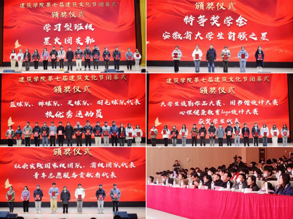 开场视频充分展示了建筑学院文化品牌在传承创新过程中涌现出的一个个青春励志片段。建筑学院第七届建筑文化节自启动以来,先后开展了25项活动,走出了一条具有建筑特色、不断创新的校园文化品牌之路,启迪了同学们的才智和灵性,发展了同学们的才艺和特长。现场,学院领导为建筑学院第七届建筑文化节中表现优异的集体和学生颁发荣誉证书并合影留念。