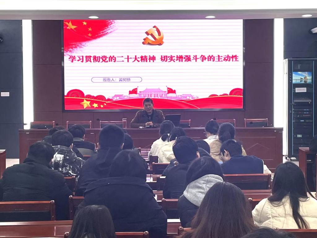 黄树桥介绍了中国共产党第二十次全国代表大会召开的时代背景和重要意义,分析总结了党的二十大报告中与斗争精神相关的内容,从斗争精神的重要性、为什么要斗争以及如何斗争三个方面开展论述,教育引导学院学生党员和学生骨干要坚持发扬斗争精神,知难而进、迎难而上。他同时要求参会学生要进一步明确自己的身份定位,时刻加强理论学习,坚定理想信仰;时刻保持党性原则,强化自律意识;时刻进行自我反省,提升能力素养。参加讲座的学生党员和学生骨干们都表示受益匪浅,接下来会自觉学习宣传贯彻党的二十大精神,深刻领会,积极践行,将青春力量融入祖国建设中。