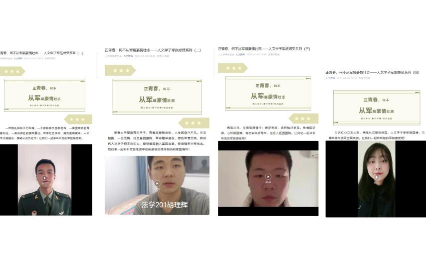 学院利用网络平台,多次推送大学生征兵宣传的内容,提高宣传实效。此外,我院开通线上线下咨询热线,人文学子可通过热线,咨询征兵信息。