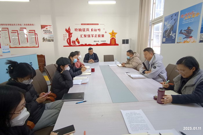 1月11日上午,学生处在征兵工作站会议室召开专题工作会议,总结2022年度工作,谋划2023年度重点工作。党委学工部部长、学生处处长黄立义,党委学工部副部长、学生处副处长陈君君、胡文靖以及学生处各科室工作人员参会。会议由黄立义主持。