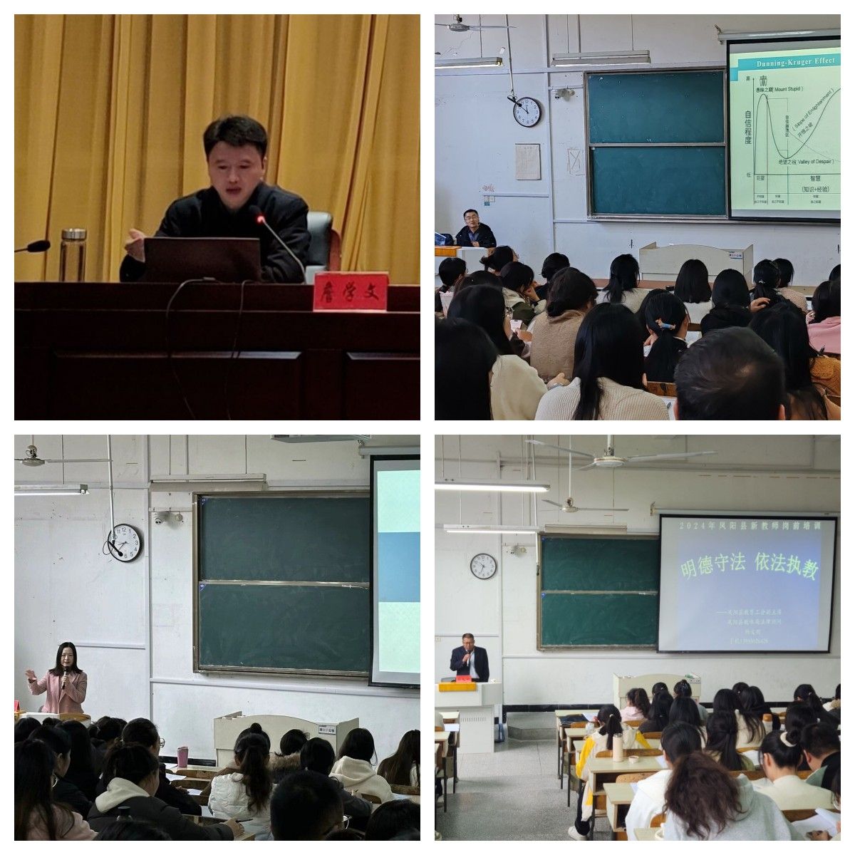 本次活动为125位新教师举办了11场专题讲座。人事处处长詹学文以“新时代教师职业行为规范”为题,强调要大力弘扬“教育家精神”,强化教师职业行为规范,不断提升教师职业水平。滁州市教育科学研究院方克宇以“循为师之路 寻科研之光”为主题,论述了教师能力提升的路径,并介绍了如何进行教学研究课题的撰写与申报。凤阳县教研室主任王金作了题为“走向专业化”的专题讲座,讲述了教师专业化的概念、教师专业化的六大法则以及教师专业标准。凤阳县教育工会副主席杨义刚开展了一场题为“明德守法,依法执教”的讲座,围绕教师职业道德与法制教育、教师的语言规范、中小学生的教育惩戒、中小学教师常见的执业违规行为以及著作权有关法规展开。