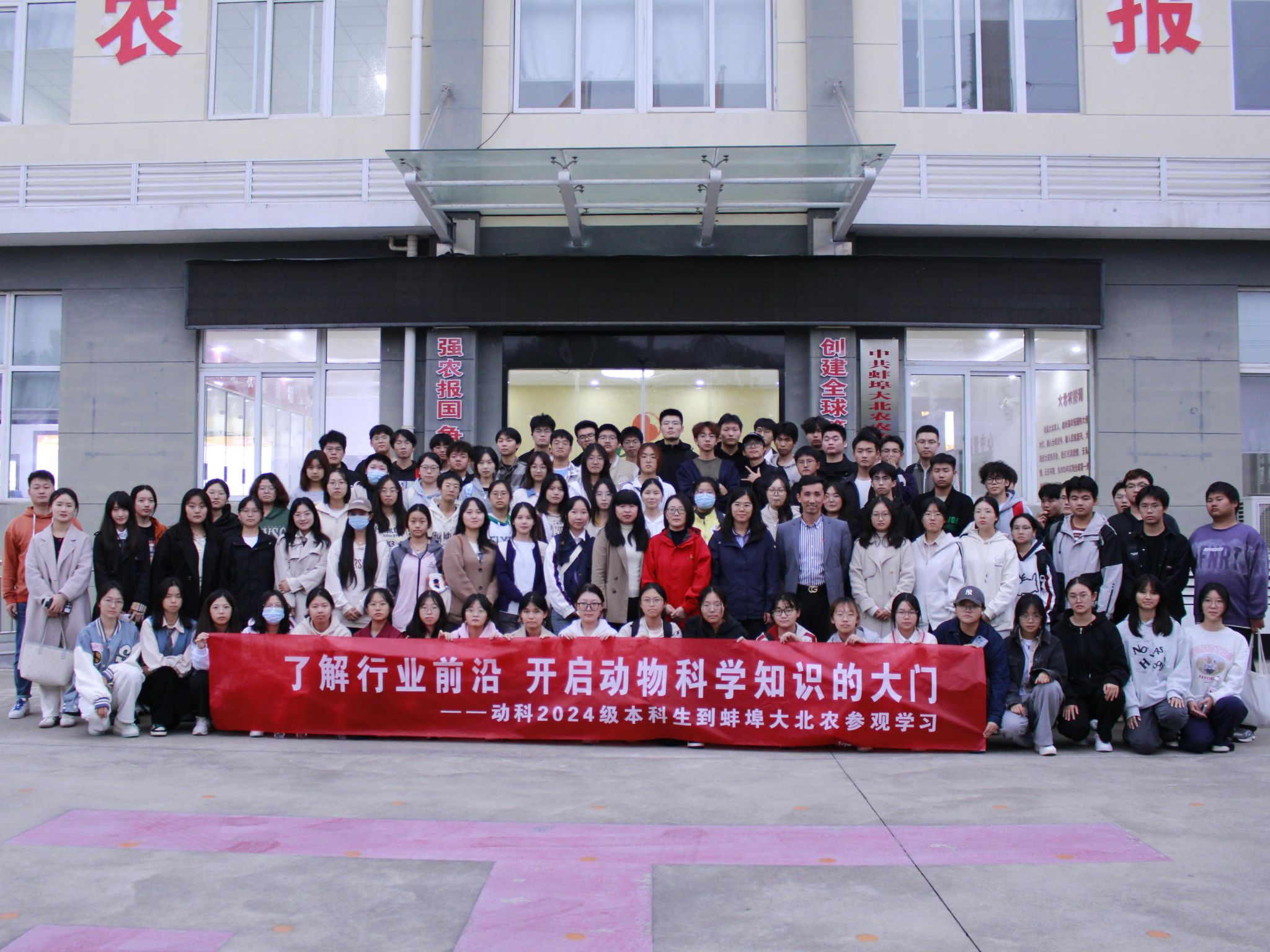 为帮助动物科学专业2024级本科生深刻认识专业发展前景,引导同学们树立正确的专业认同感和职业责任感,动物科学学院动物科学系创新工作思路,将专业教育的课堂开设在企业生产一线。11月15日,动物科学系主任王淑娟副教授、动物科学教工党支部书记王世琴博士以及党员教师代表,带领91名本科生前往蚌埠市大北农农牧科技有限责任公司参观学习。