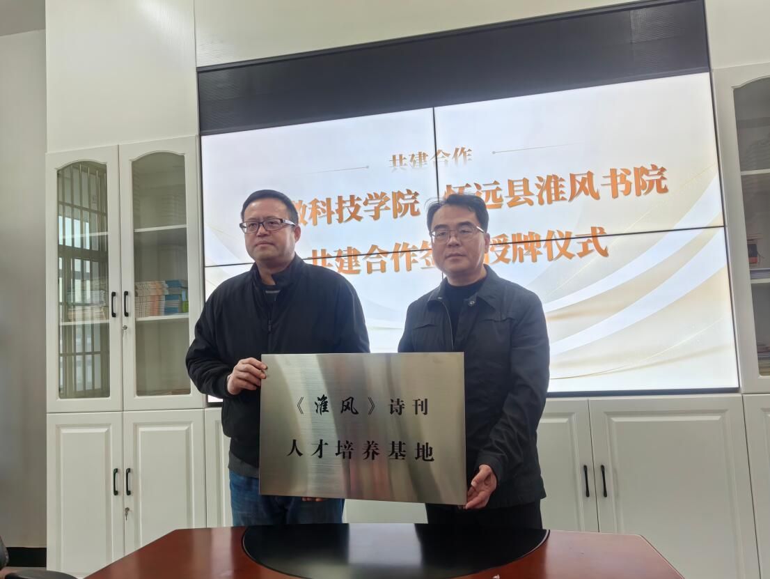 在签约暨授牌仪式上,李晓东、宫蔚国分别代表双方签署了共建实习实训基地协议,并举行“MILAN.COM共建合作基地”“《淮风》诗刊人才培养基地”“ 《淮风》诗刊文学创作基地”授牌仪式。