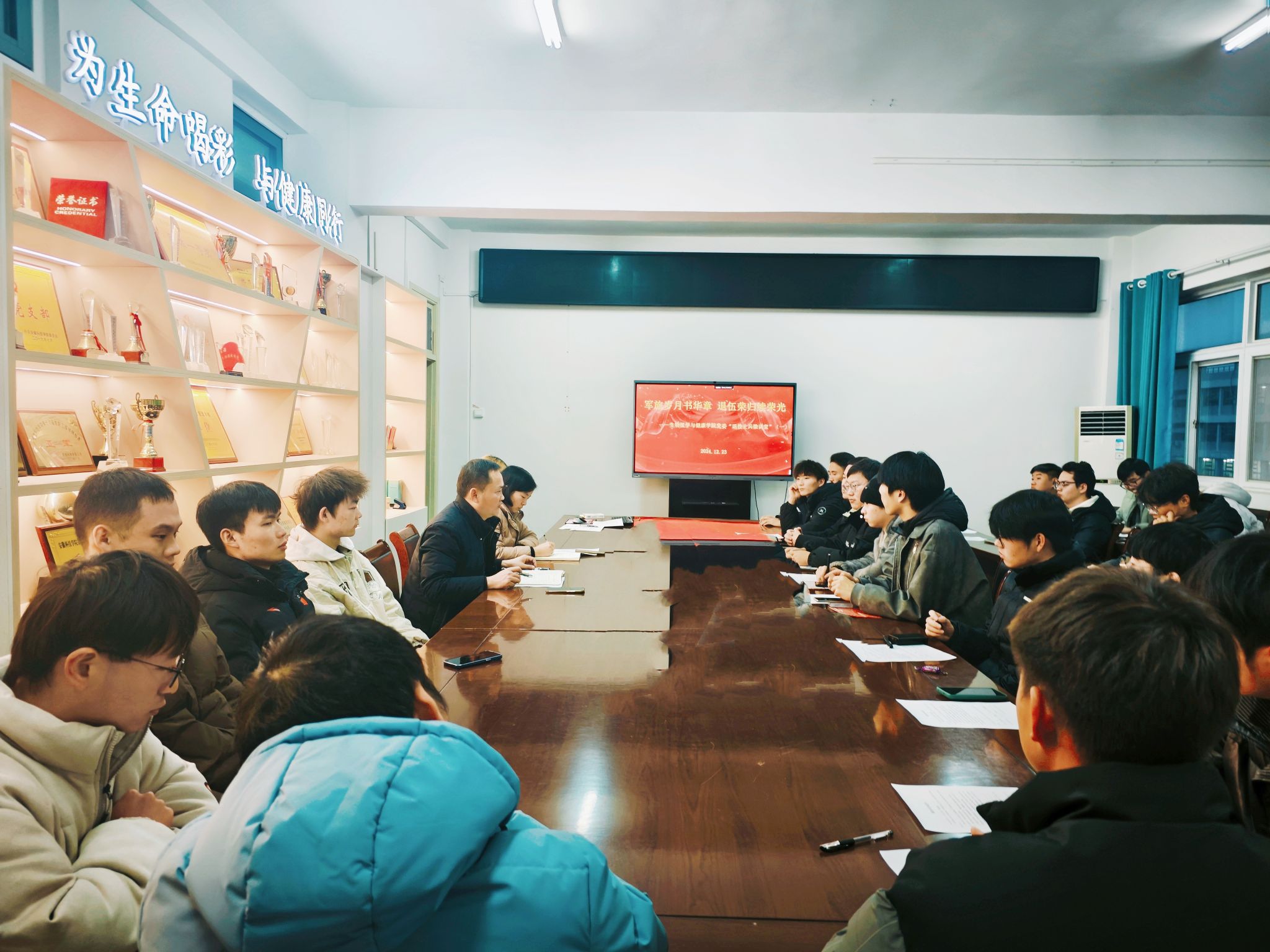 12月23日下午,生物医学与健康学院在学知楼417会议室举办第一期“退役士兵微讲堂”。学院党委书记张传德,党委副书记、纪委书记彭丽萍,学院有关教师及2025年春季应征入伍报名学生参加微讲堂。学院5位退役大学生应邀出席。微讲堂由彭丽萍主持。