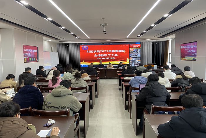 2月19日下午,财经学院召开2025年春季新学期全体教职工会议。学院党政班子成员、全体教职工参加会议,会议由学院党委书记杜小明主持。