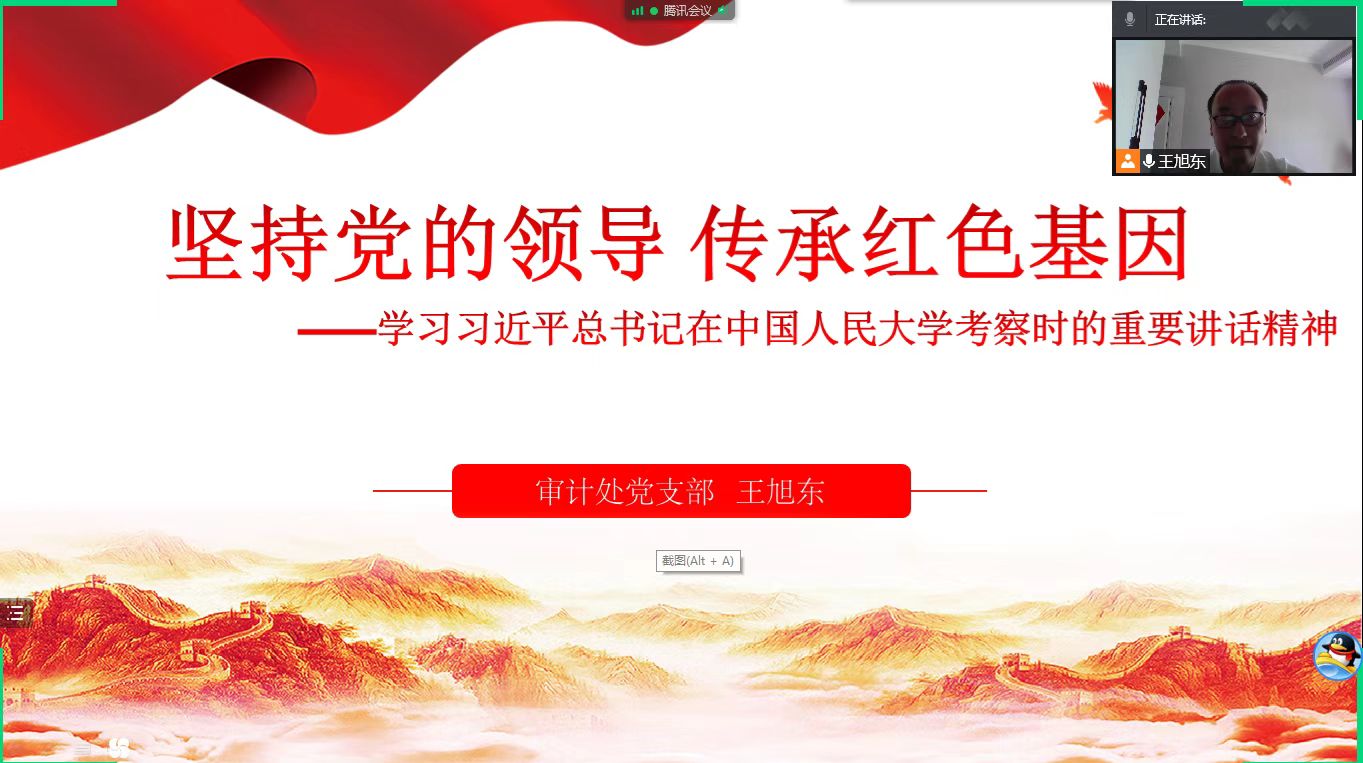 鉴于当前疫情防控形势和部分党员居家办公实际,主题党日活动通过腾讯会议视频方式进行。支部书记朱立政同志首先带领大家集体学习了习近平总书记在中国人民大学考察时的重要讲话精神。他指出,习近平总书记的重要讲话立意高远、内涵丰富、思想深邃、情真意切,为新时代建设中国特色世界一流大学注入了信念之魂,开掘了发展之源,擘画了奋进之路。支部全体党员要深入学习领会,结合工作贯彻落实。他表示,今年是我校实施“更名大学”行动计划、开创一流应用型大学建设新局面的关键之年,我们要有争创一流的勇气和决心,着力推动审计提质增效,为学校事业高质量发展贡献审计智慧和力量。
