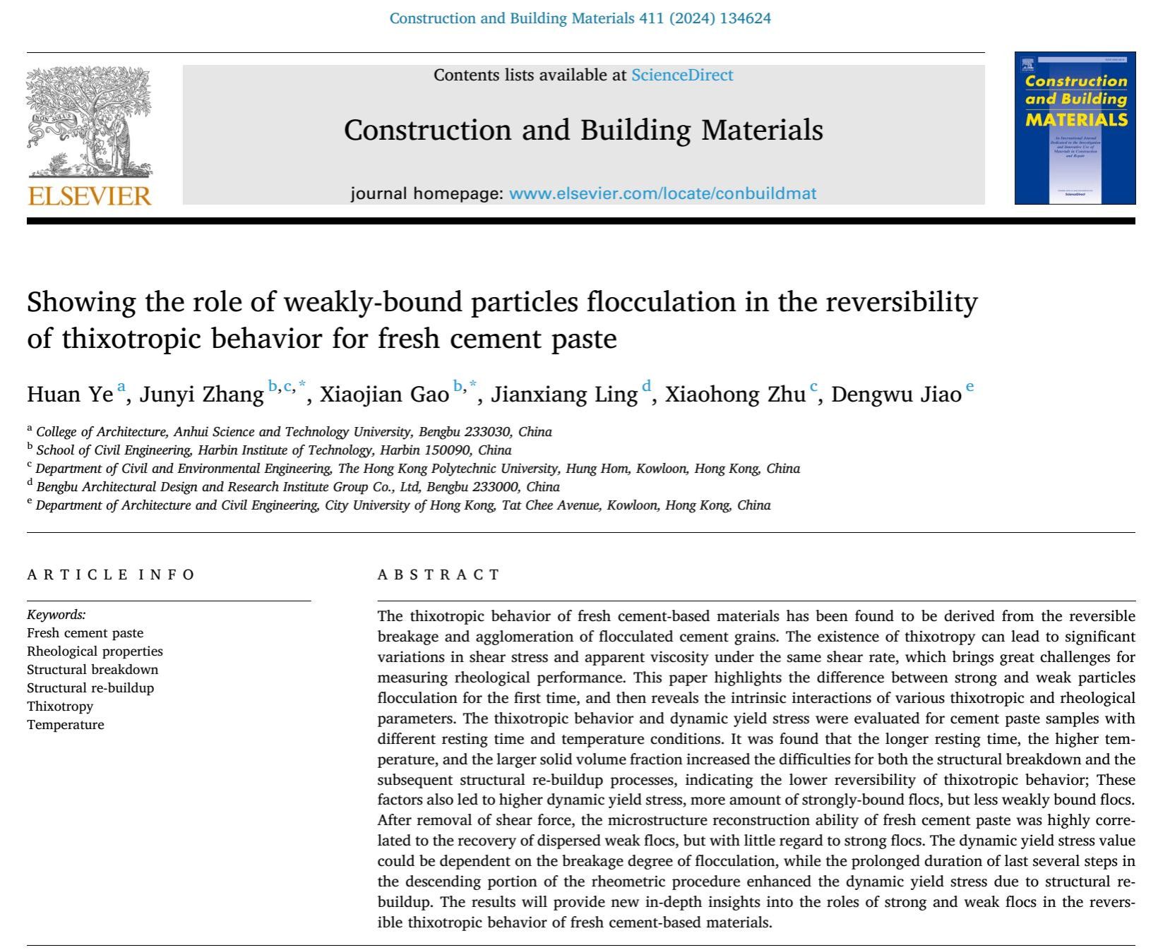 近日,我校建筑学院教师叶焕以第一作者在国际学术期刊《Construction and Building Materials》(中科院分区:工程技术1区Top期刊。影响因子:7.4)发表题为“Showing the role of weakly-bound particles flocculation in the reversibility of thixotropic behavior for fresh cement paste”的研究论文。我校为第一完成单位,合作单位为哈尔滨工业大学、蚌埠市建筑设计研究院集团有限公司等。