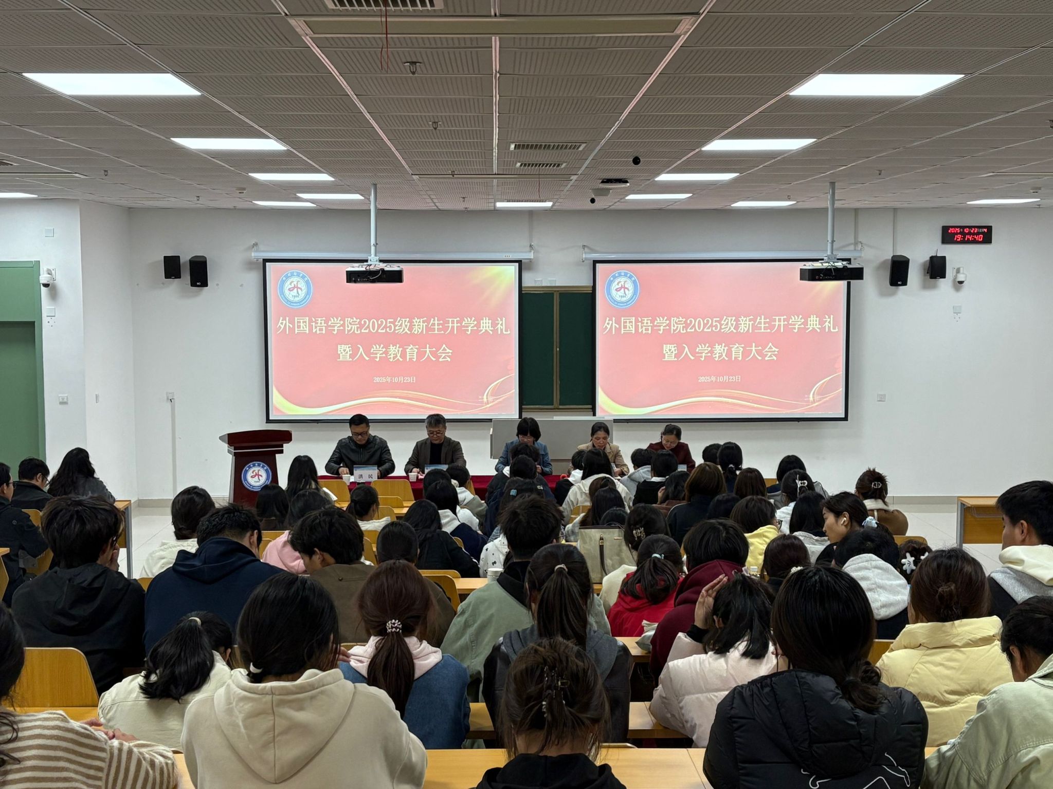 为进一步做好新生入学教育,帮助新生更好地适应大学生活,10月23日晚,外国语学院在学术报告厅召开了2025级新生开学典礼暨入学教育大会。外国语学院党政领导、2025级新生导师、全体辅导员、教师代表、校友代表、老生代表以及2025级全体新生参加大会,会议由学院党委书记蔡为青主持。