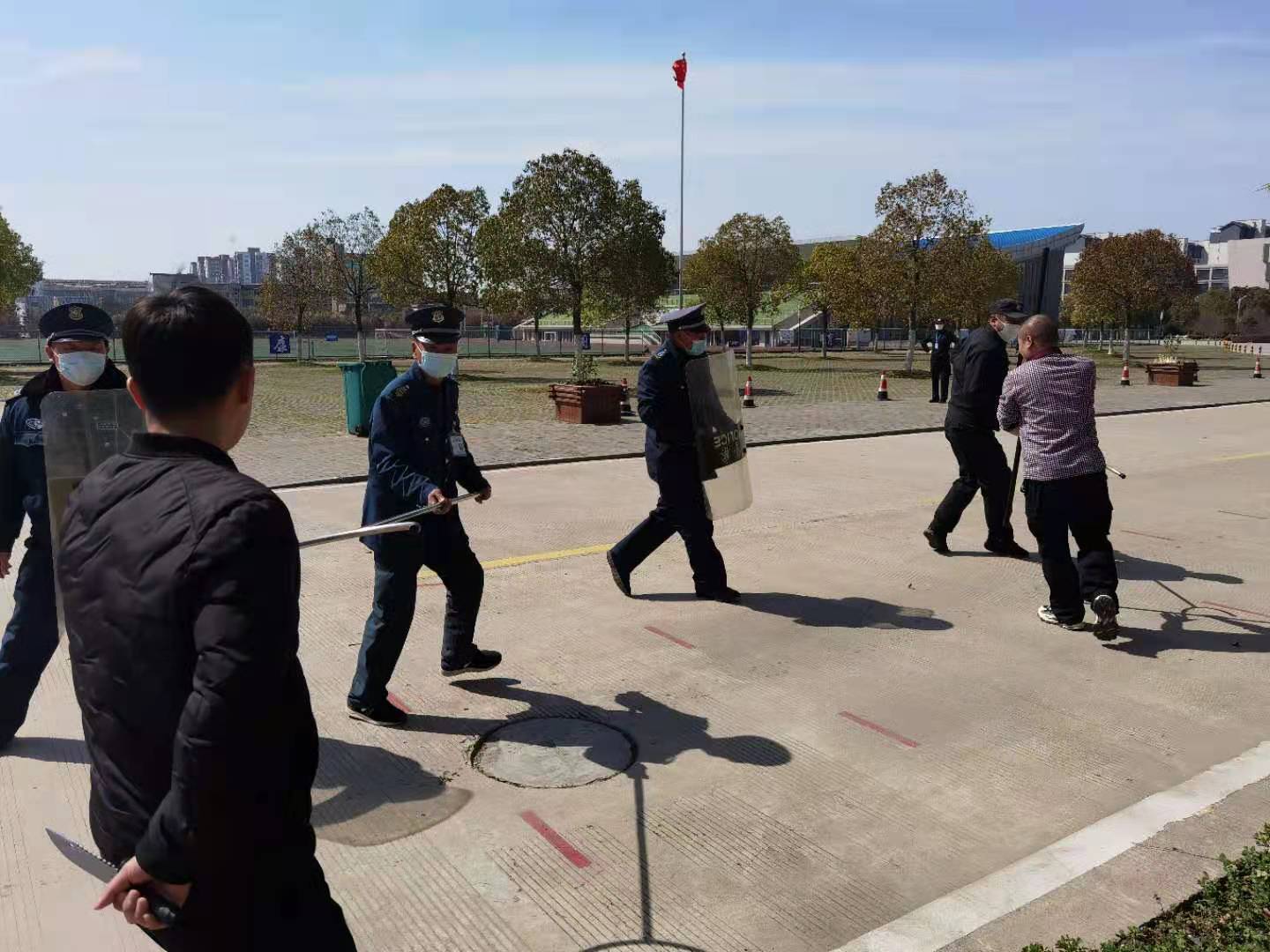 演练全程,公安干警与学校保卫力量配合得力,达到了较好的演练效果。演练后,派出所副所长李祥和保卫处领导现场进行演练总结,在涉暴涉恐事件发生时,警力如何展开救援;学校安保人员如何加强防范,如何有效使用警棍、钢叉、防护盾牌等防暴器材阻止控制歹徒;如何在危急时刻报警处置作了进一步强调。