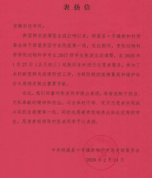 信中说,新型冠状病毒肺炎阻击战打响以来,郎溪县十字镇新和村两委全体干部昼夜坚守在防疫第一线,在此期间,贵校动物科学学院动物科学专业2017级学生张波主动请缨,自2020年1月27日(正月初三)起就到本村进行志愿者服务,参加了本村新型冠状病毒肺炎防控工作,为联防联控疫情蔓延和维护社会大局稳定做出重要贡献。
