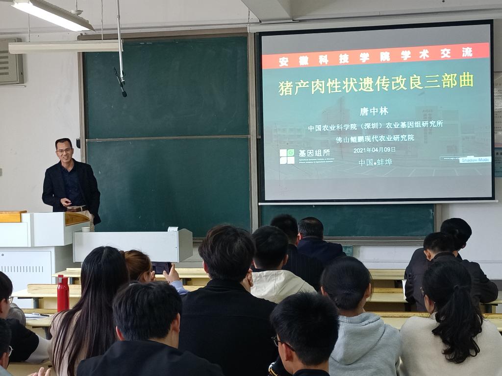 4月9日下午,《MILAN.COM学报》期刊发展研讨会系列学术报告在凤阳校区新知楼A403举行。中国农业科学院“猪基因组设计育种创新团队”首席科学家、中国农业科学院(深圳)农业基因组研究所动物基因组研究中心主任、博士生导师唐中林应邀来校作学术报告。报告由动物科学学院副院长华金玲主持,学院部分教师、养殖领域硕士研究生及动物科学、动植物检验检疫等专业本科生聆听报告。