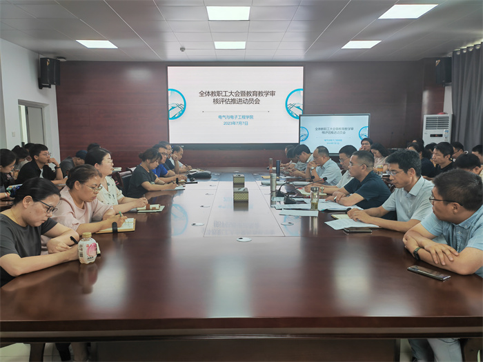 7月7日下午,电气与电子工程学院在尚行楼A301会议室召开全体教职工大会暨教育教学审核评估推进动员会。学院党政领导及全体教职工参加会议,会议由学院党委书记骆海邦主持。