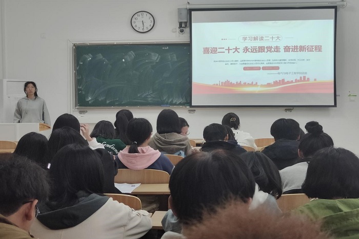 为深入领悟党的二十大报告的核心要义和精神实质,大力弘扬伟大建党精神,10月29日下午,电气与电子工程学院团委在致知楼C108开展“喜迎二十大 永远跟党走 奋进新征程”主题团日活动。学院团委全体成员及2021级、2022级全体团支书参加了本次活动。活动由团委陈烁彤主持。