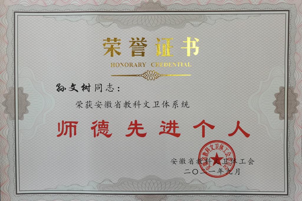 近日,安徽省教科文卫体工会下发《关于选树安徽省教科文卫体系统职业道德先进个人的通报》,我校教师孙文树被选树为“师德先进个人”。