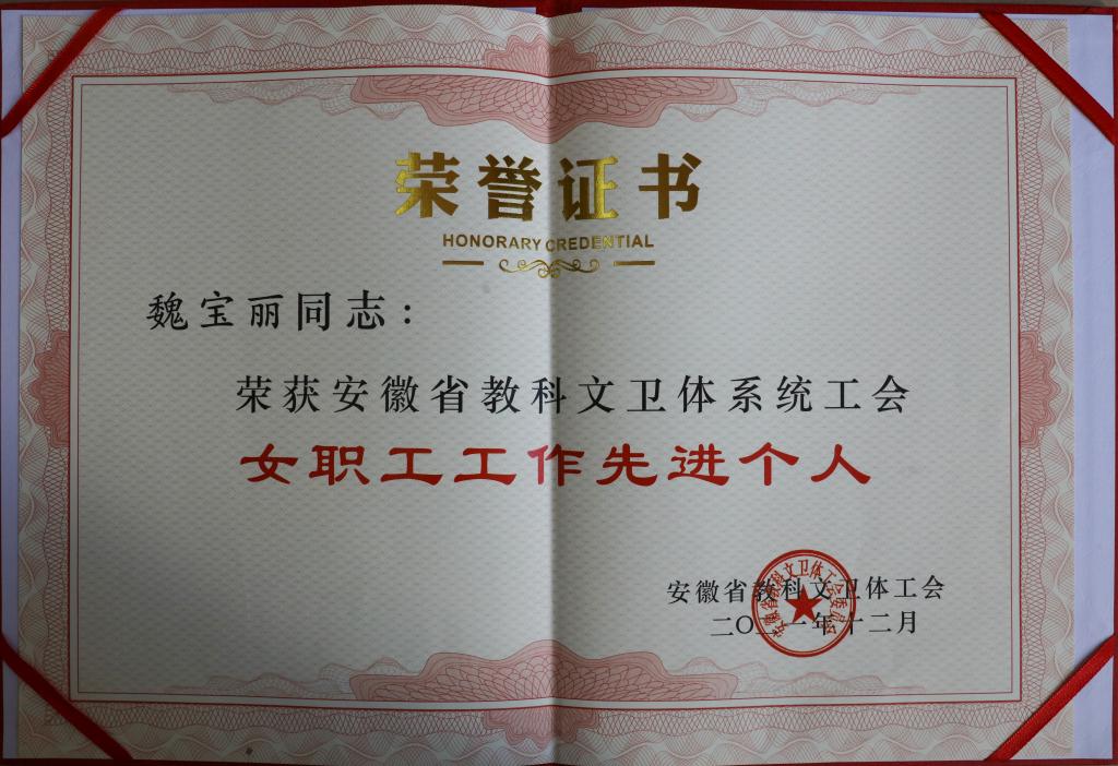 我校工会女职工委员会荣获“先进集体”光荣称号。校工会女职工委员副主任、机械工程学院分工会主席魏宝丽副教授荣获“先进个人”光荣称号。