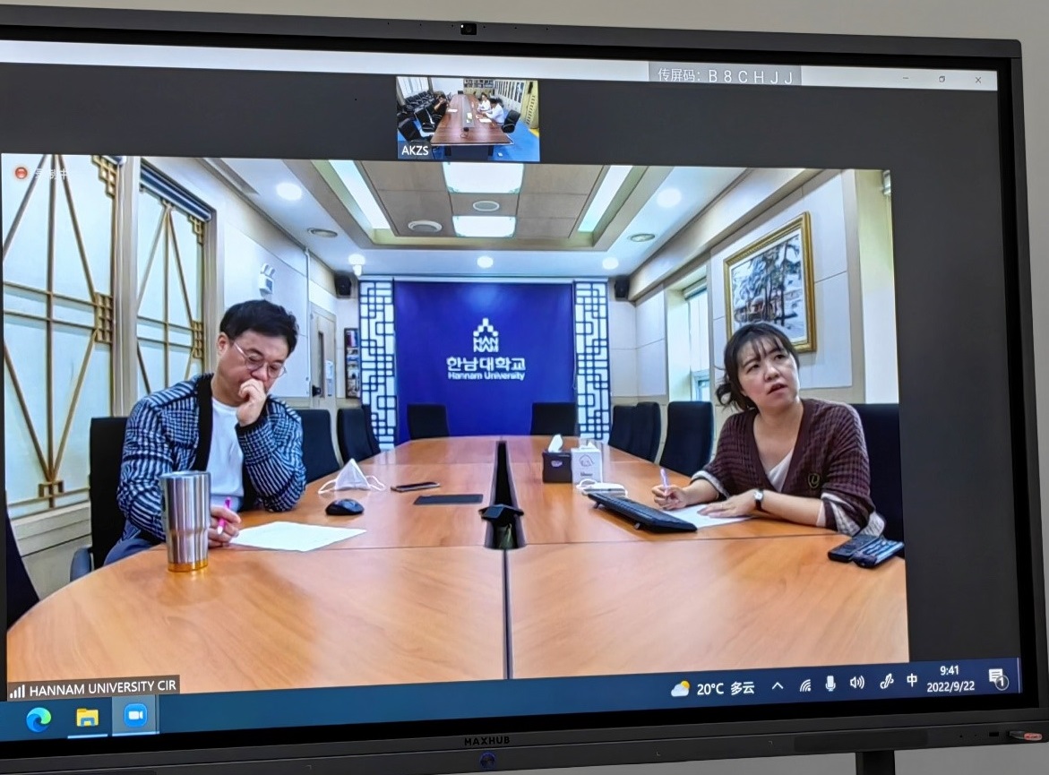 9月22日上午,国际交流与合作处与韩国韩南大学国际交流中心举行视频会议。国际交流与合作处处长刘东楼、副处长陈德用、秘书于卉,韩南大学国际交流中心副处长金元培、中华圈合作主管连漪参加会议。