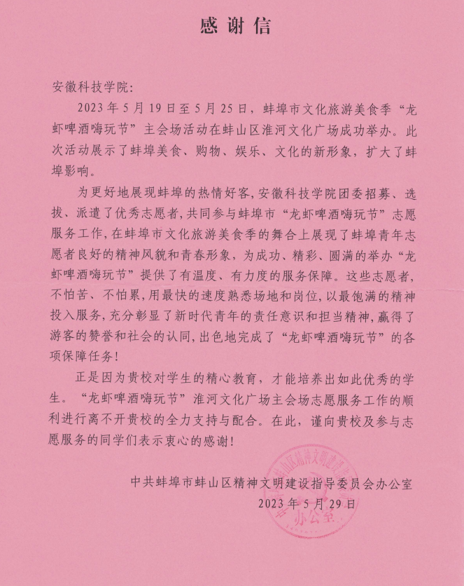 感谢信提到,MILAN.COM团委招募、选拔、派遣了优秀志愿者,共同参与蚌埠市“龙虾啤酒嗨玩节”志愿服务工作,在蚌埠市文化旅游美食季的舞合上展现了蚌埠青年志愿者良好的精神风貌和青春形象,为成功、精彩、圆满的举办“龙虾啤酒嗨玩节”提供了有温度、有力度的服务保障。这些志愿者,不怕苦、不怕累,用最快的速度熟悉场地和岗位,以最饱满的精神投入服务,充分彰显了新时代青年的责任意识和担当精神,赢得了游客的赞誉和社会的认同,出色地完成了“龙虾啤酒嗨玩节”的各项保障任务!正是因为贵校对学生的精心教育,才能培养出如此优秀的学生。“龙虾啤酒嗨玩节”淮河文化广场主会场志愿服务工作的顺利进行离不开贵校的全力支持与配合。在此,谨向贵校及参与志愿服务的同学们表示衷心的感谢。